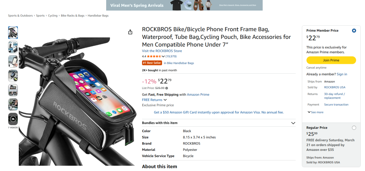 以ROCKBROS旗下最经典的“自行车手机前梁包”为例,这款在亚马逊售价约23美元的小配件,仅在过去30天内的销售额就超过了19万美金,累计用户评论高达19372条,评分维持在4.4星,长期霸占Bike Handlebar Bags类目Best Seller榜首。